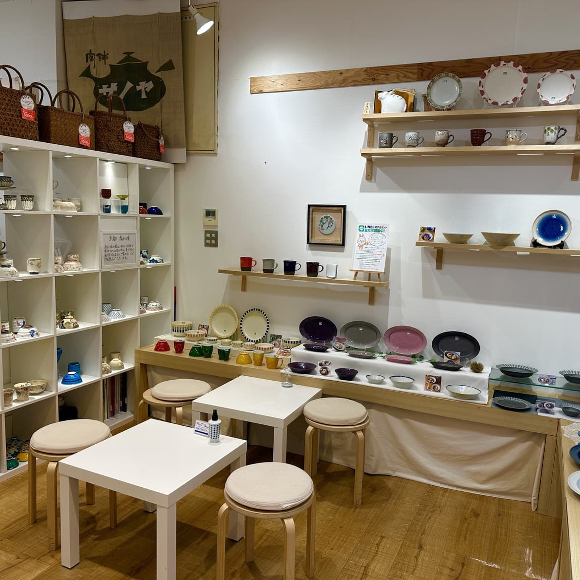 お客様にごゆっくりと器をお選びいただくためのテーブルが2台とチェアが4台が店内にございます。またその横の内側のボックスには選りすぐりの清水焼も少量はございますがご紹介をしてございます。