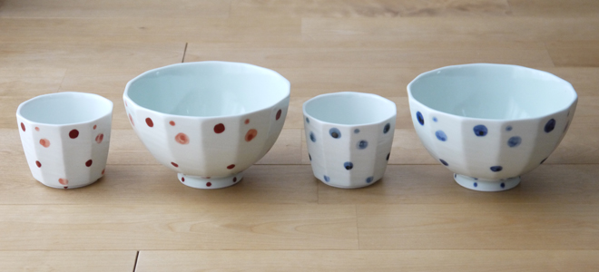 手描きで描いた2色の水玉が絶妙なかわいらしさを演出。面取りはお持ちやすさを実現
